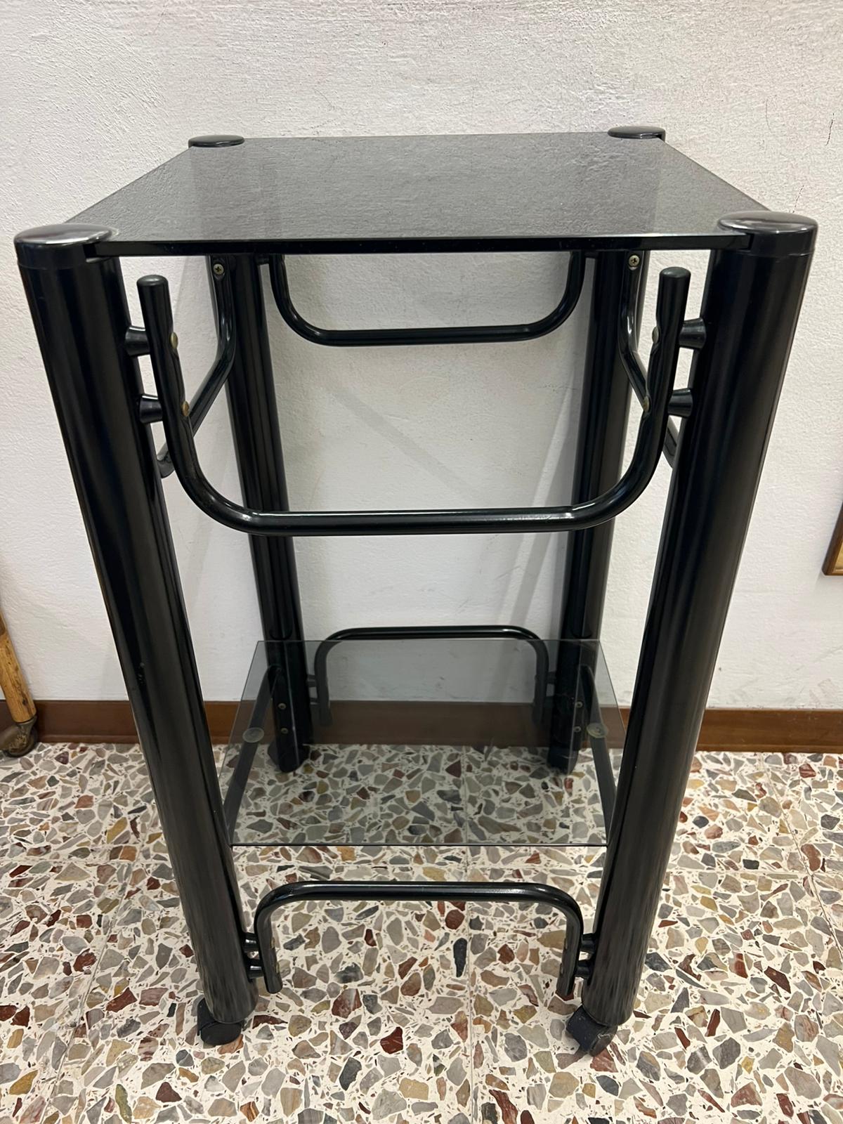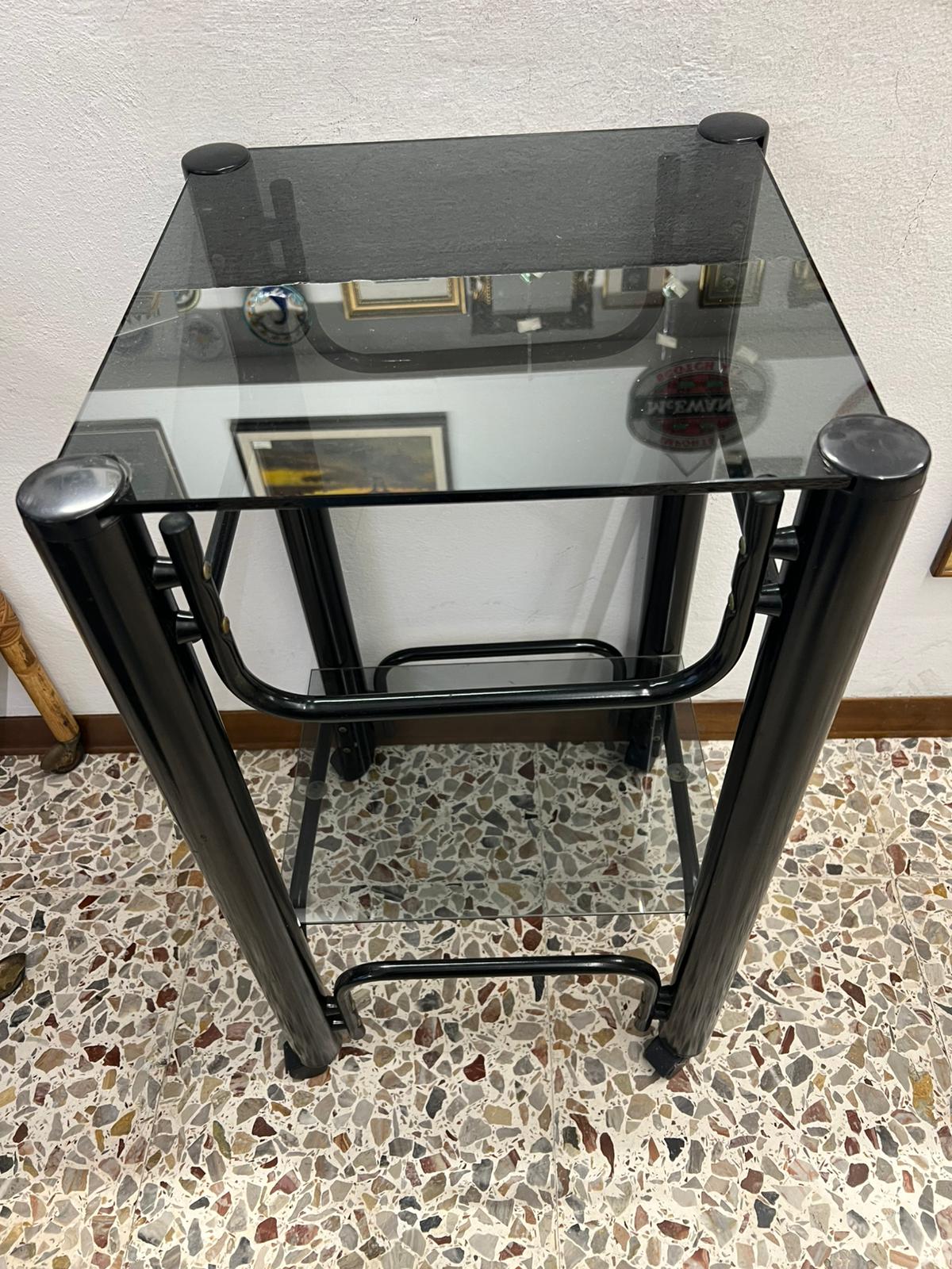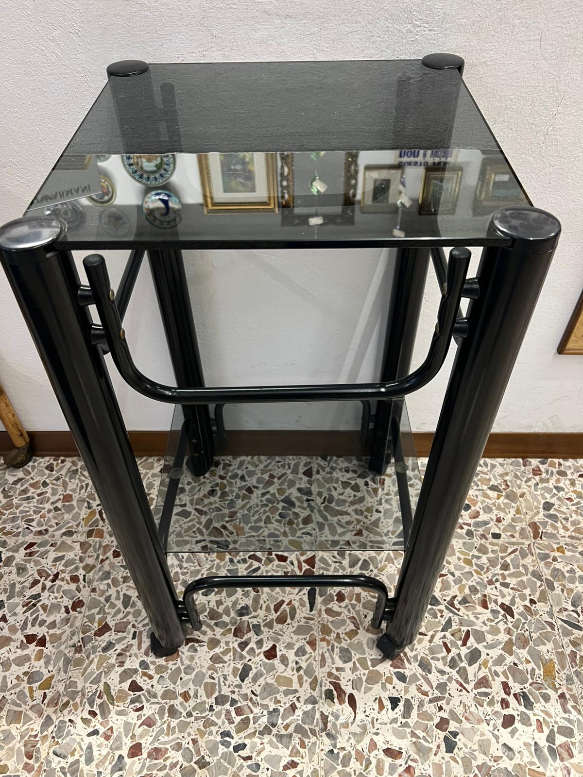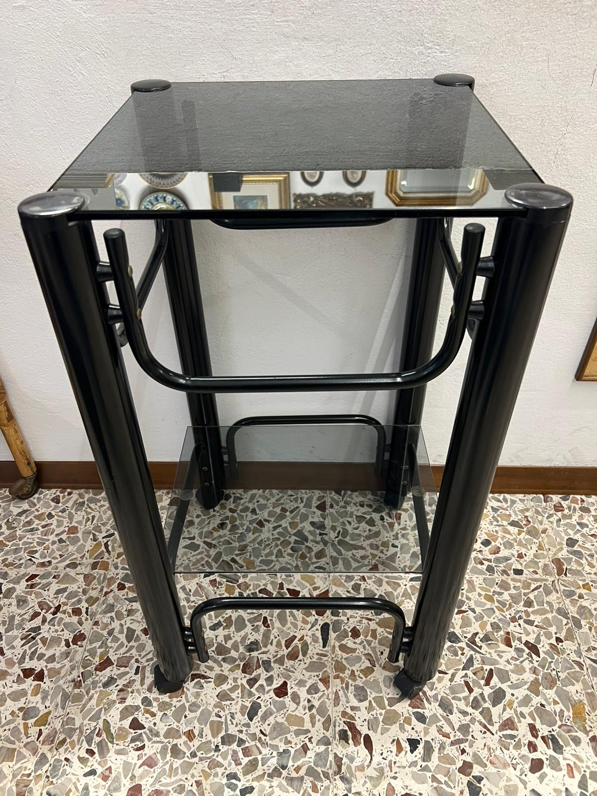 CARRELLINO ALTO QUADRATO GIREVOLE IN FERRO E VETRO FUME’ ANNI ’70
