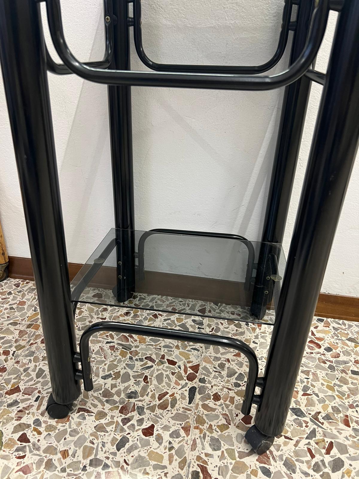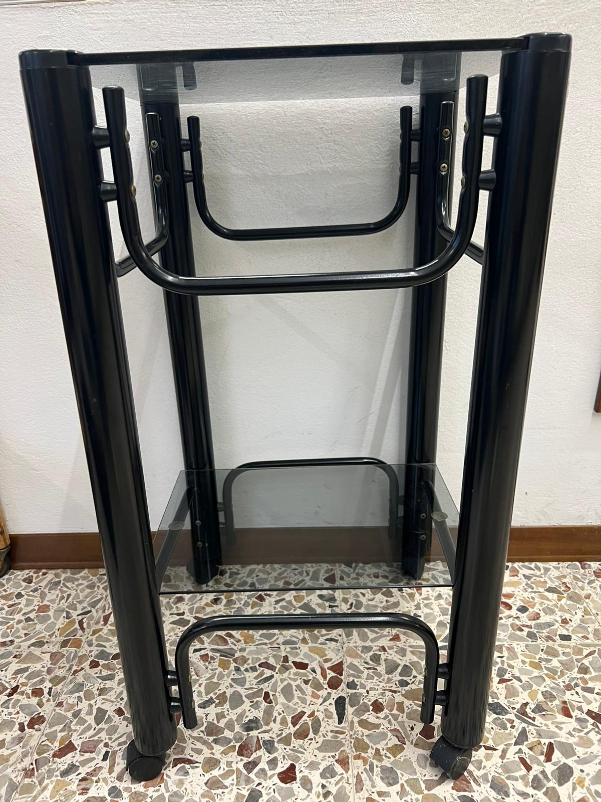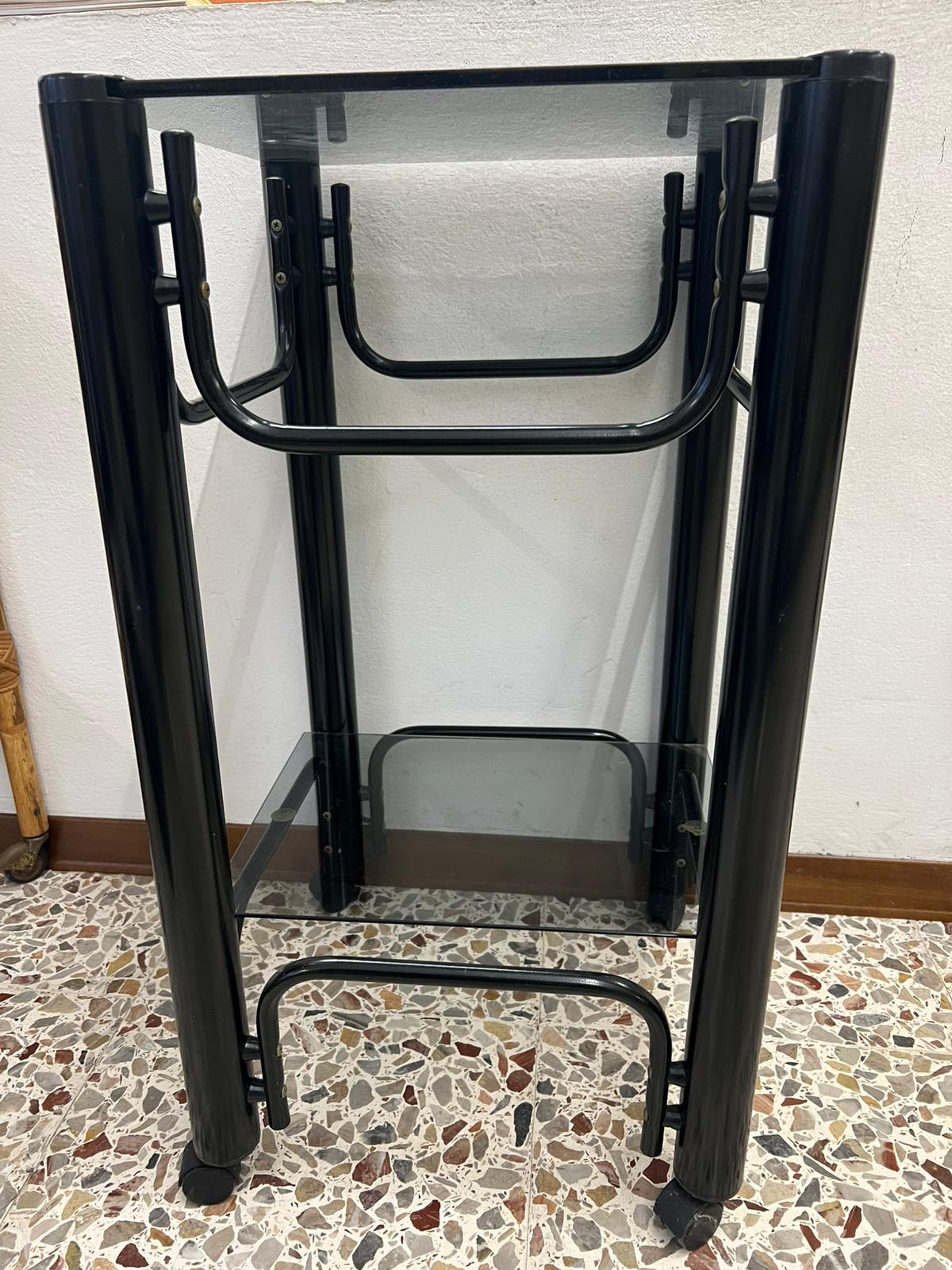 CARRELLINO ALTO GIREVOLE IN FERRO E VETRO FUME’ ANNI ’70