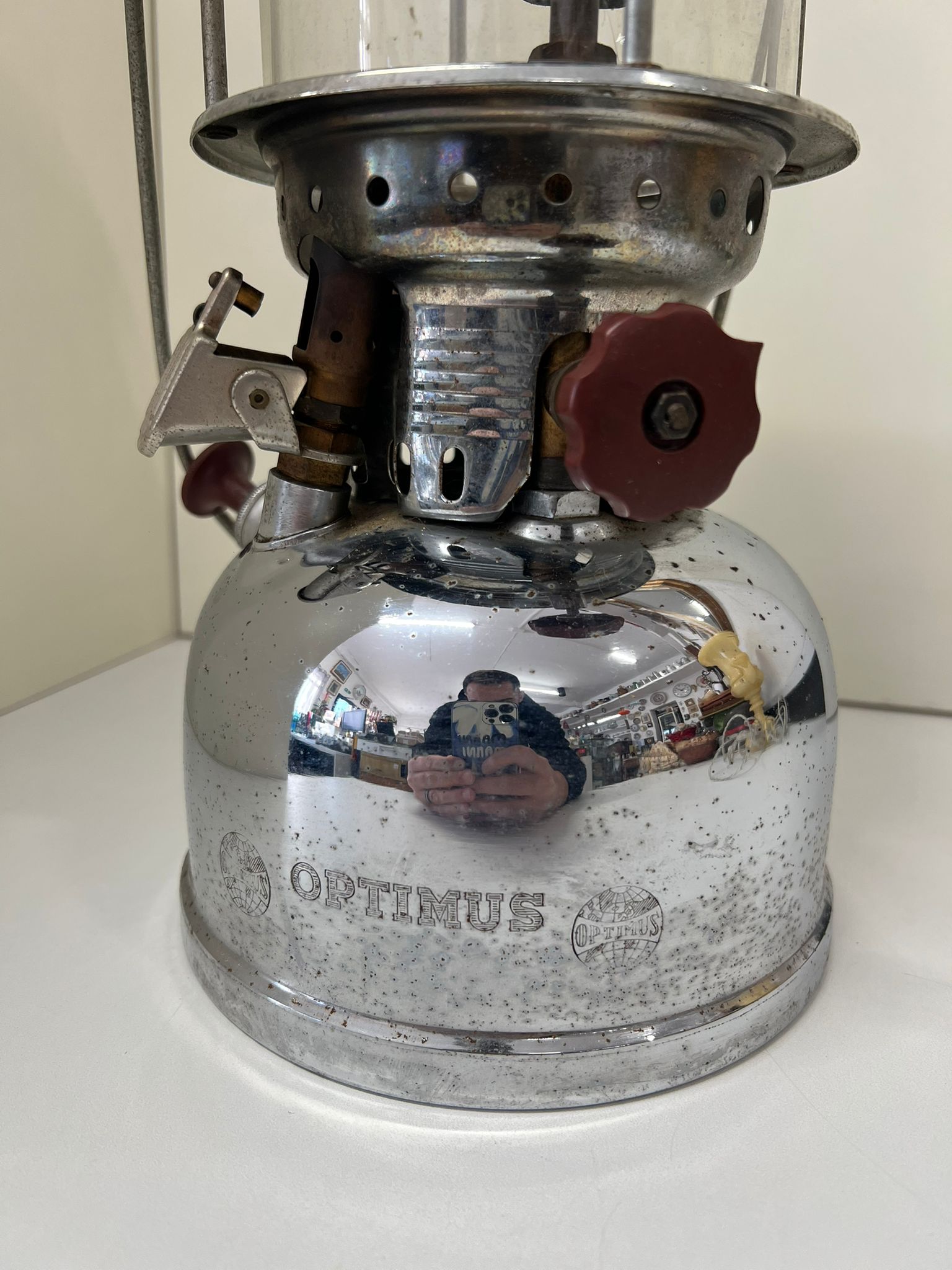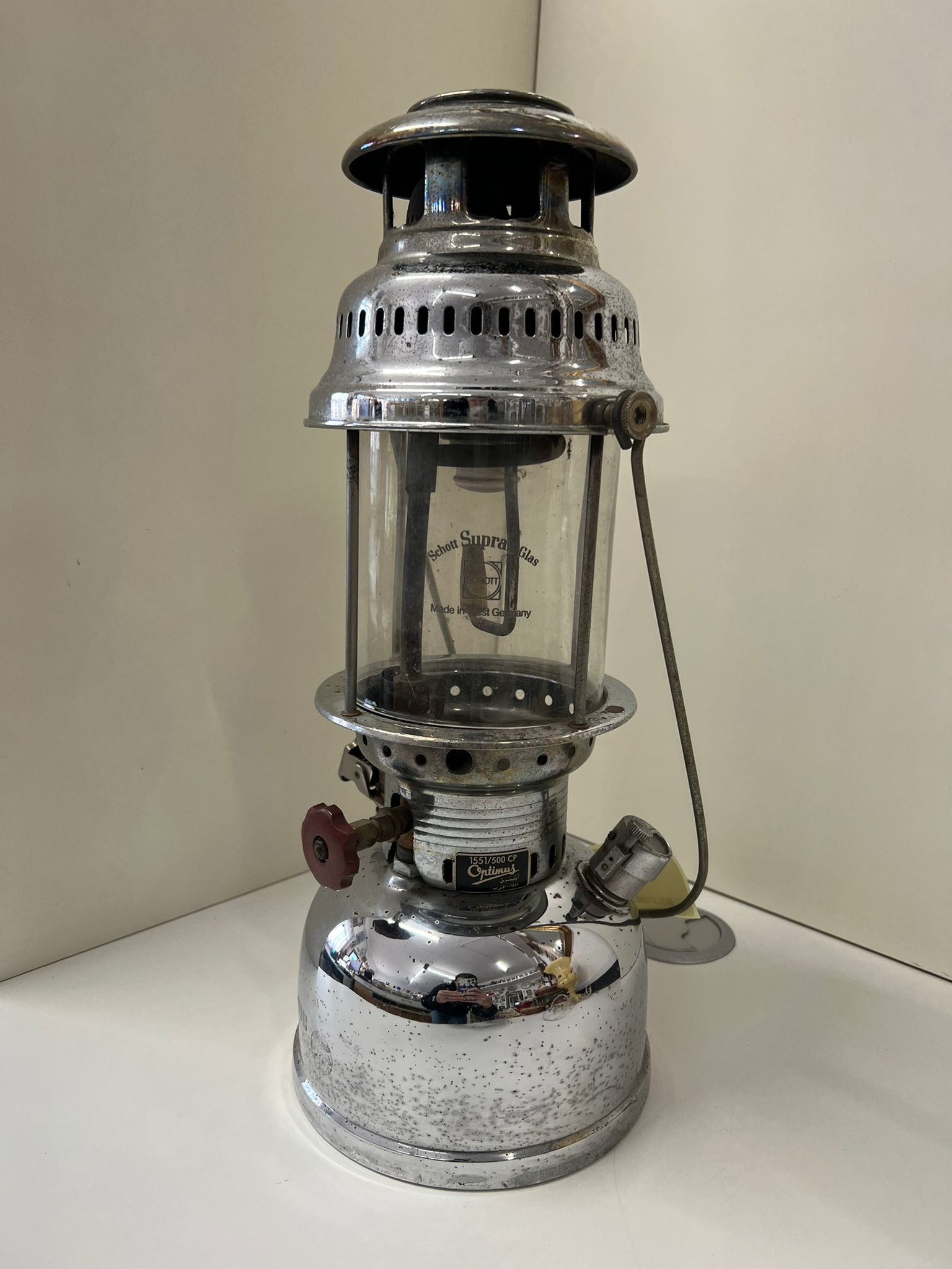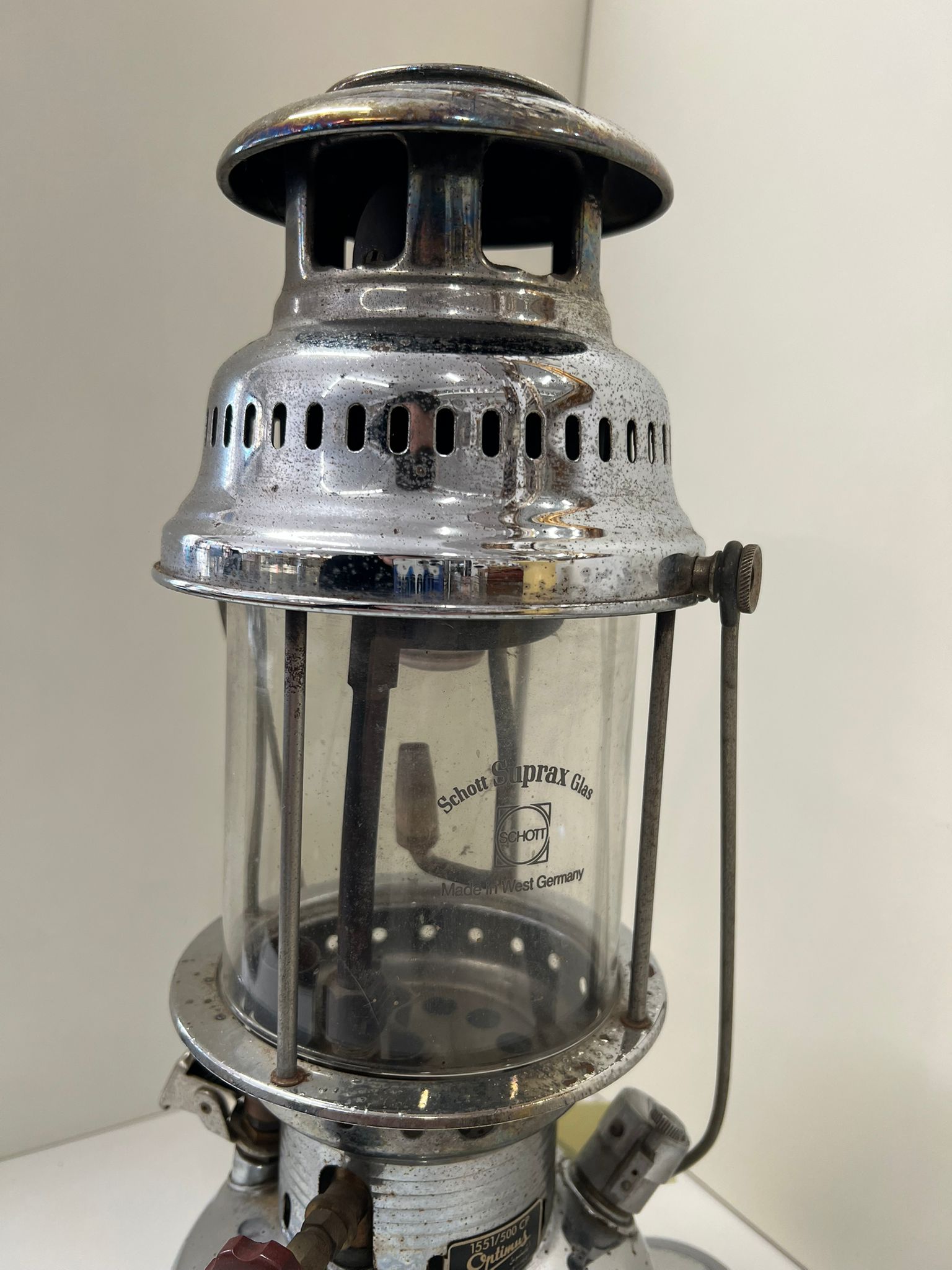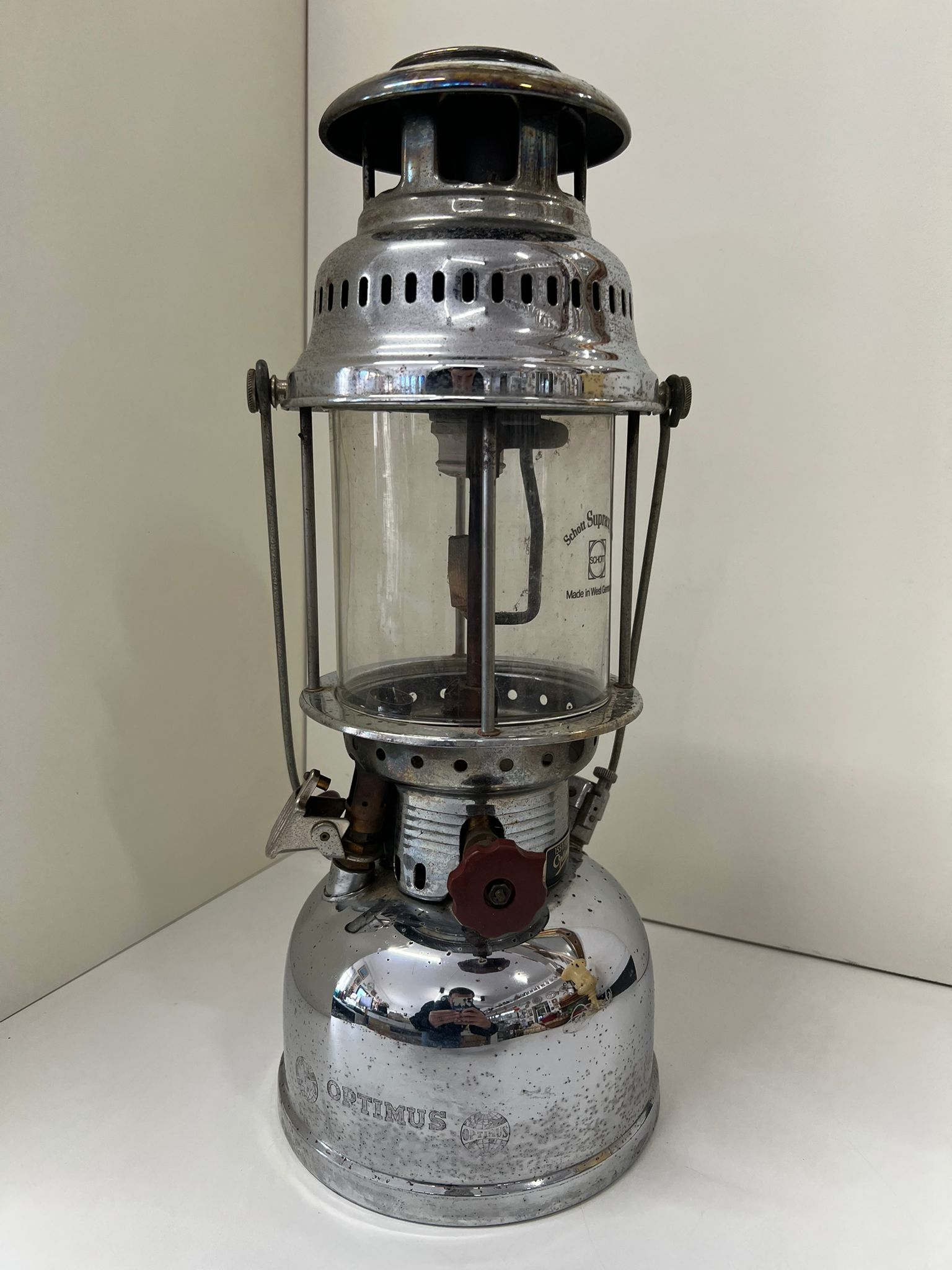 Bellissima lanterna vintage a cherosene prodotta da Optimus nel 1990-2000. È realizzato in ottone cromato e genera circa 500 Watt. Funziona con carburante a cherosene e dispone di un sistema di preriscaldamento automatico.