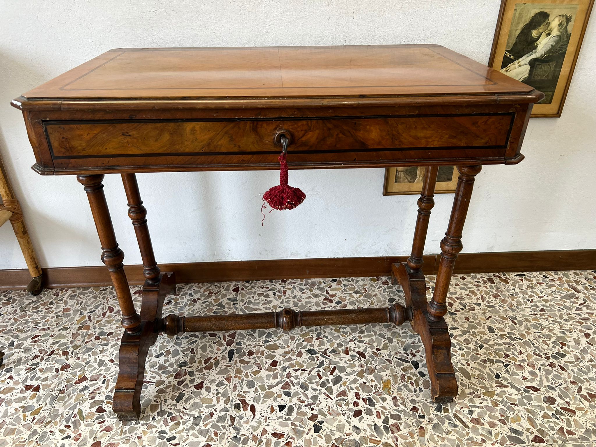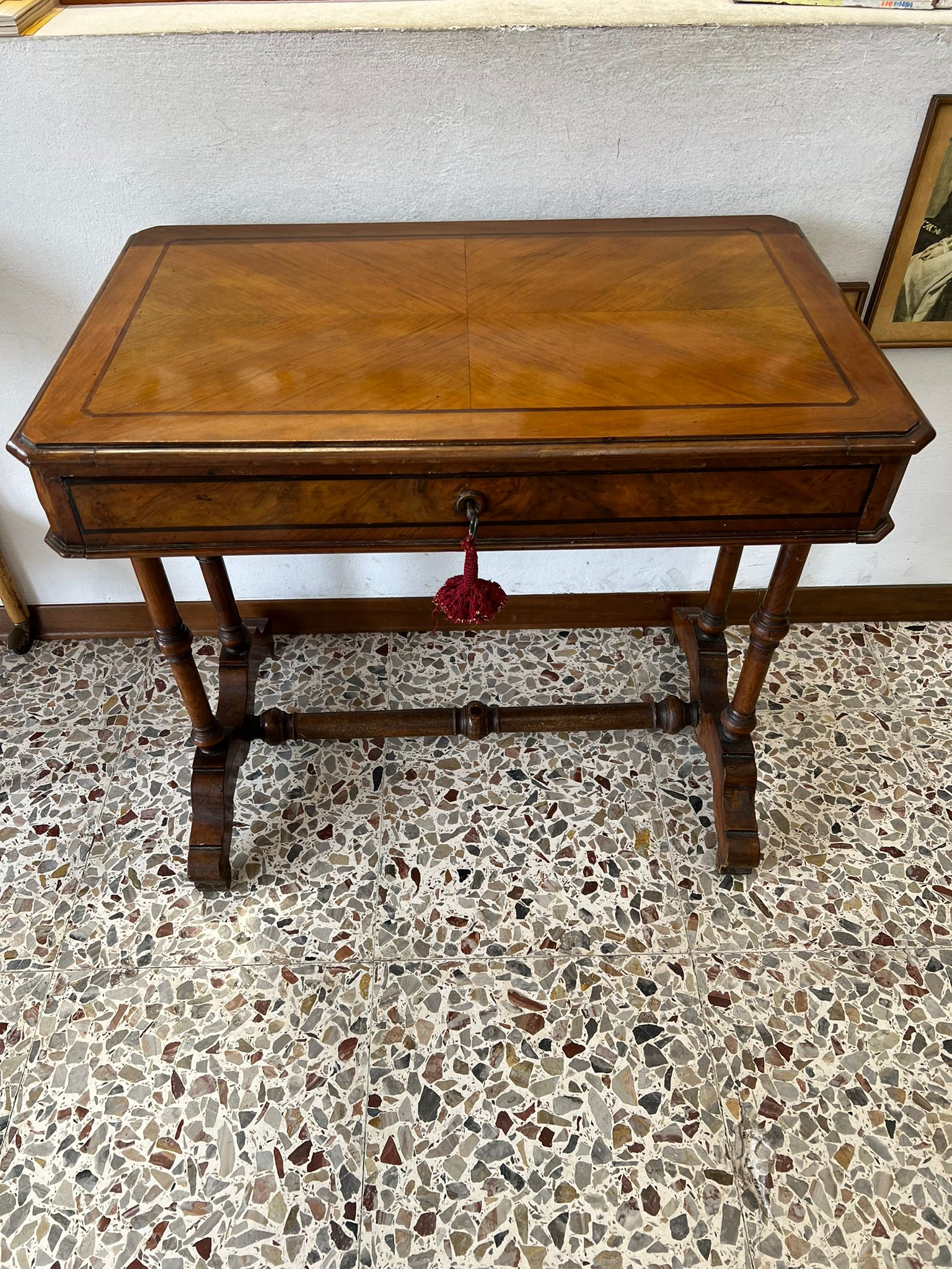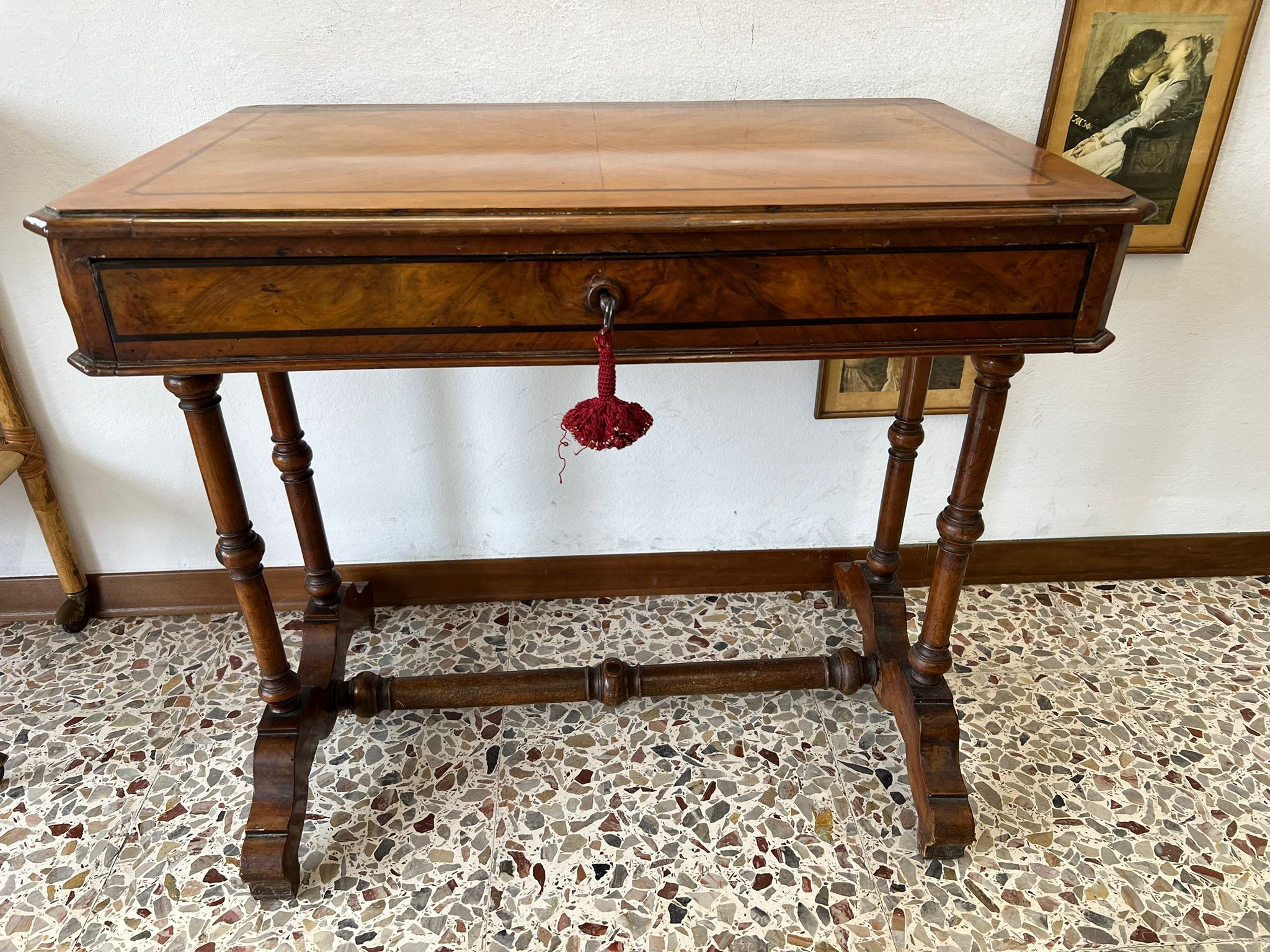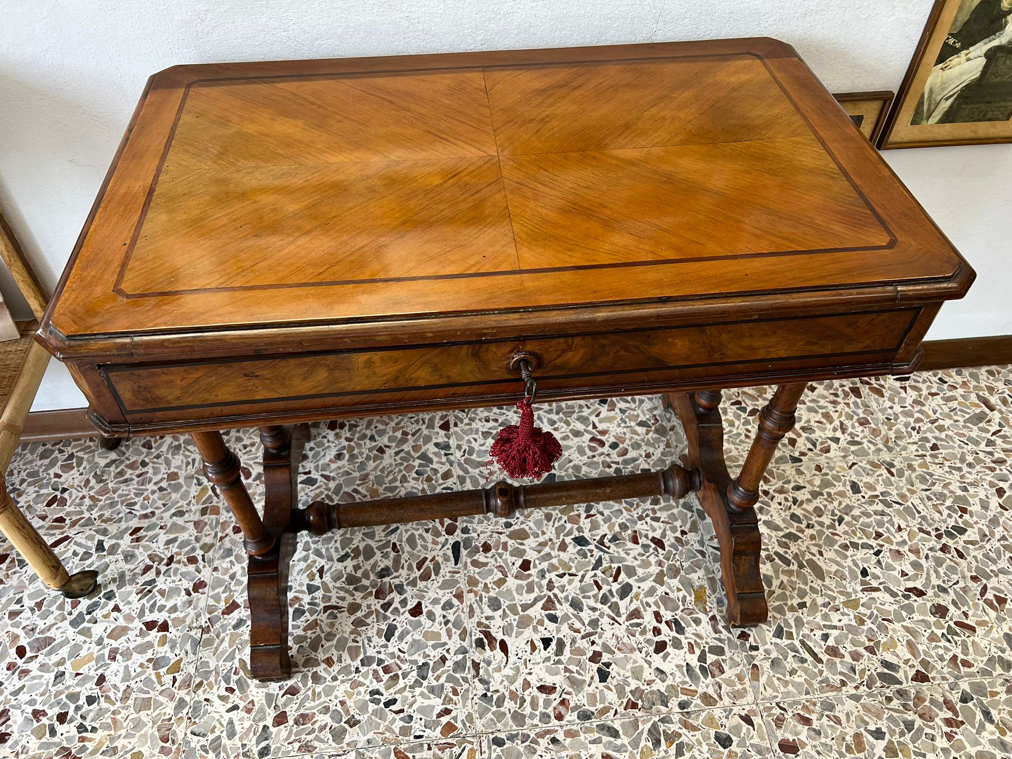 TAVOLINO DA LAVORO PER CUCITO IN NOCE SPINATO E FILETTATO SECONDA META’ DEL ‘800