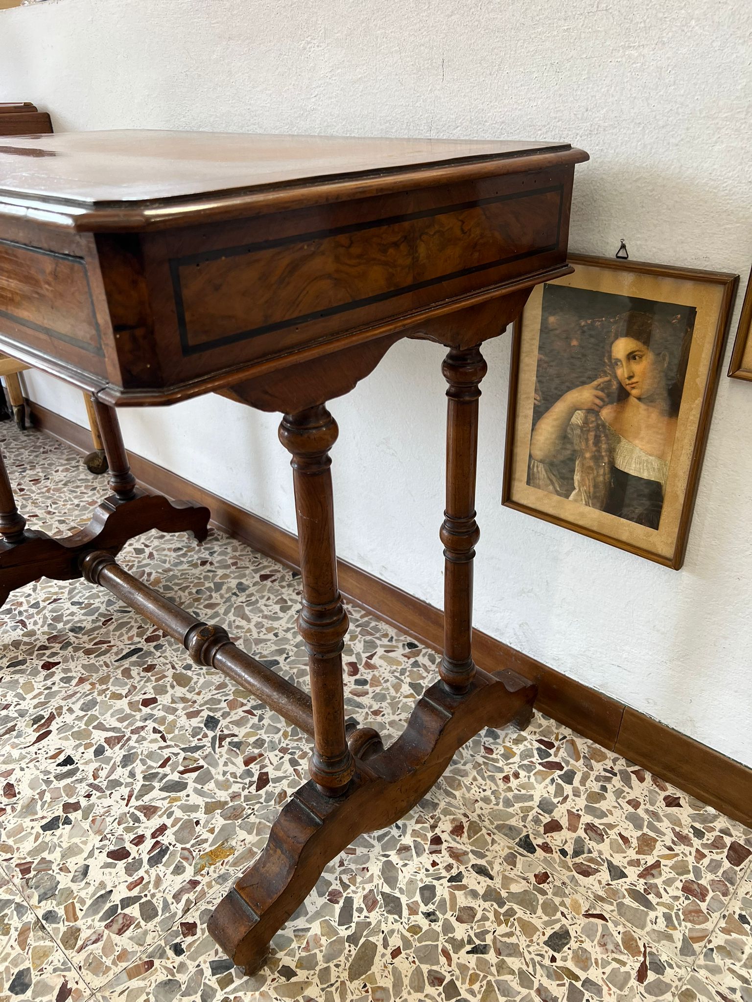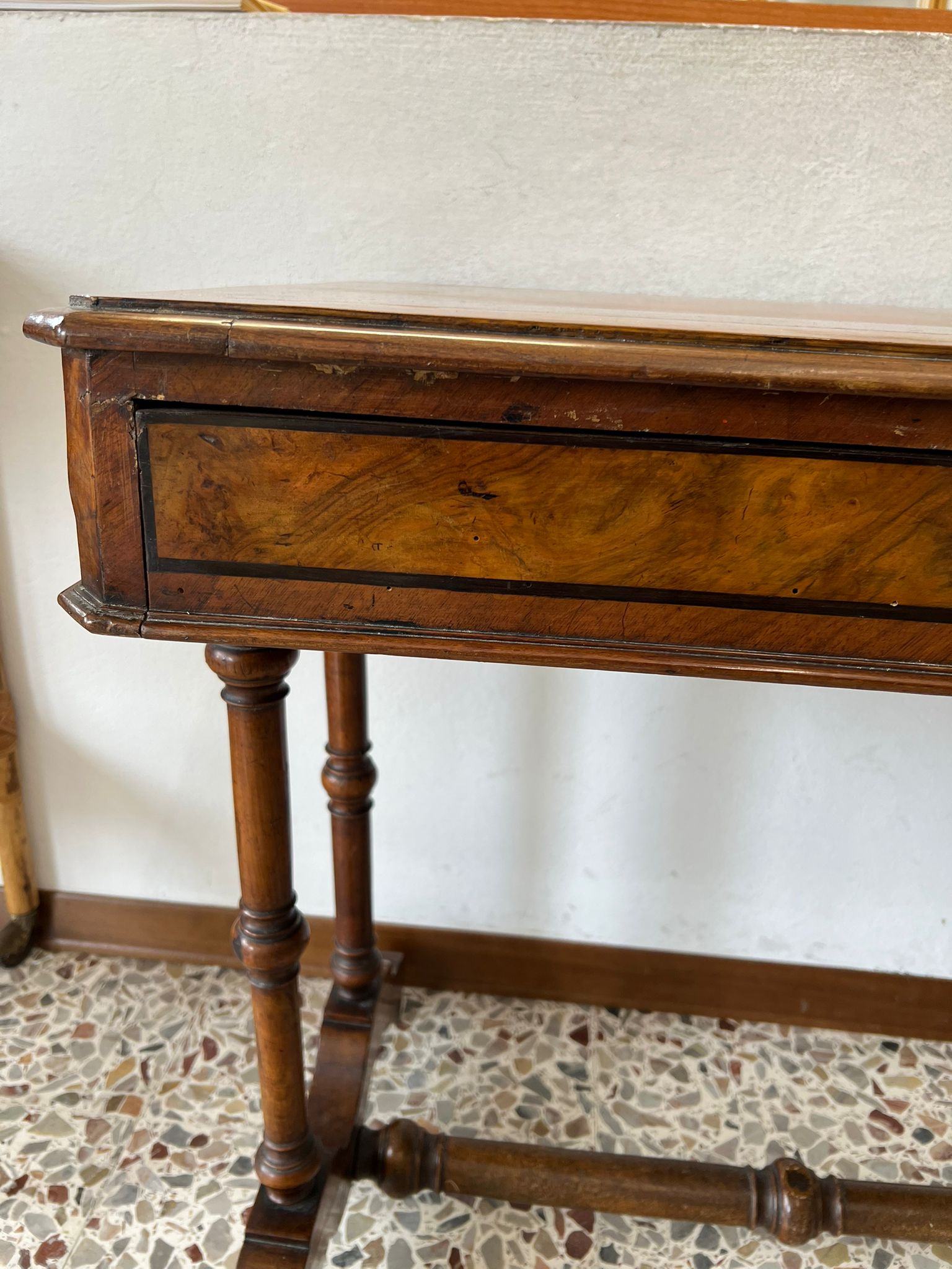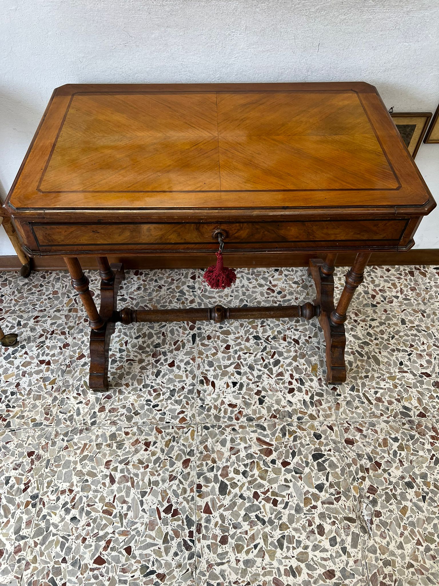 TAVOLINO DA LAVORO PER CUCITO IN NOCE SPINATO E FILETTATO SECONDA META’ DEL ‘800