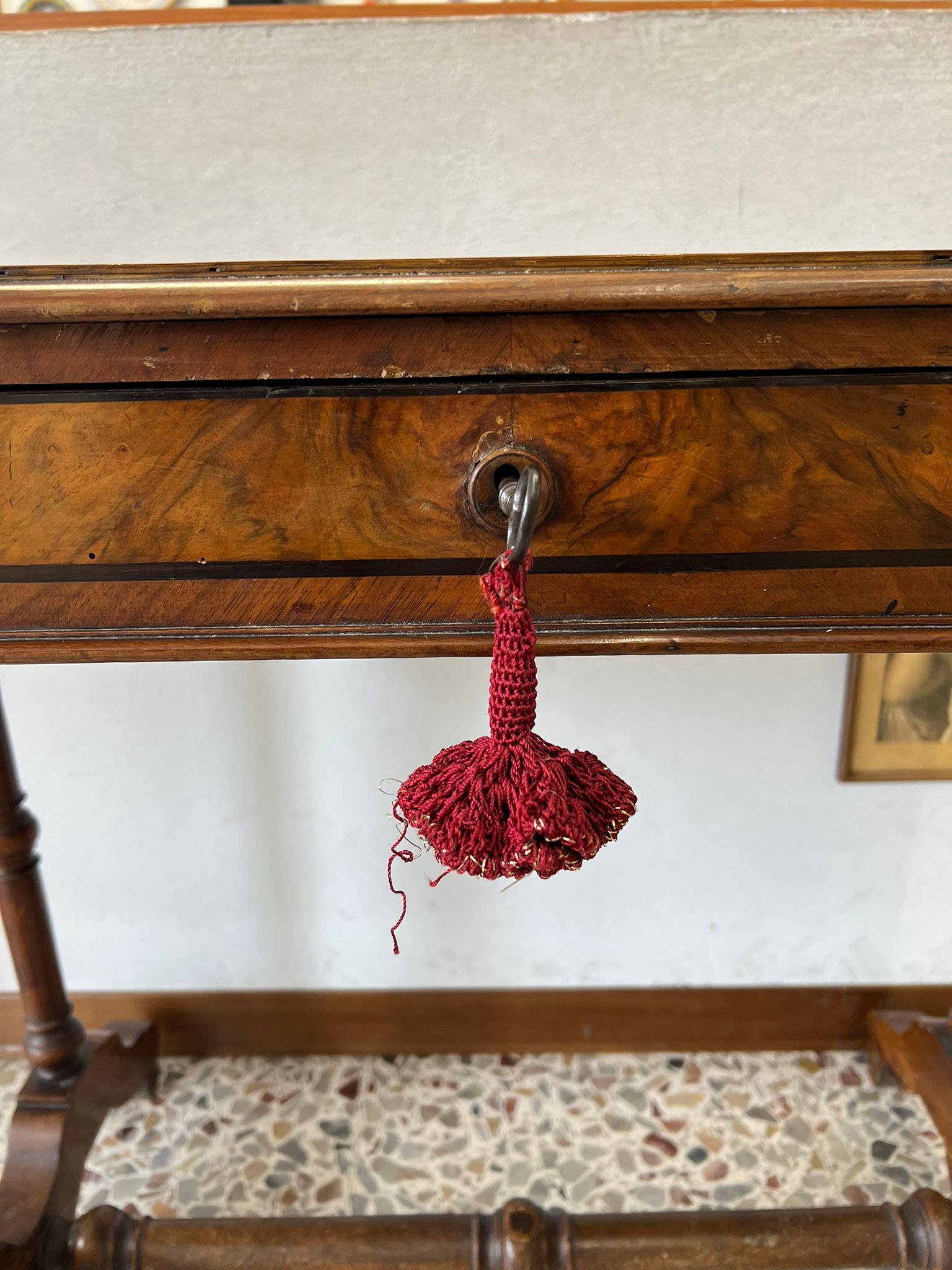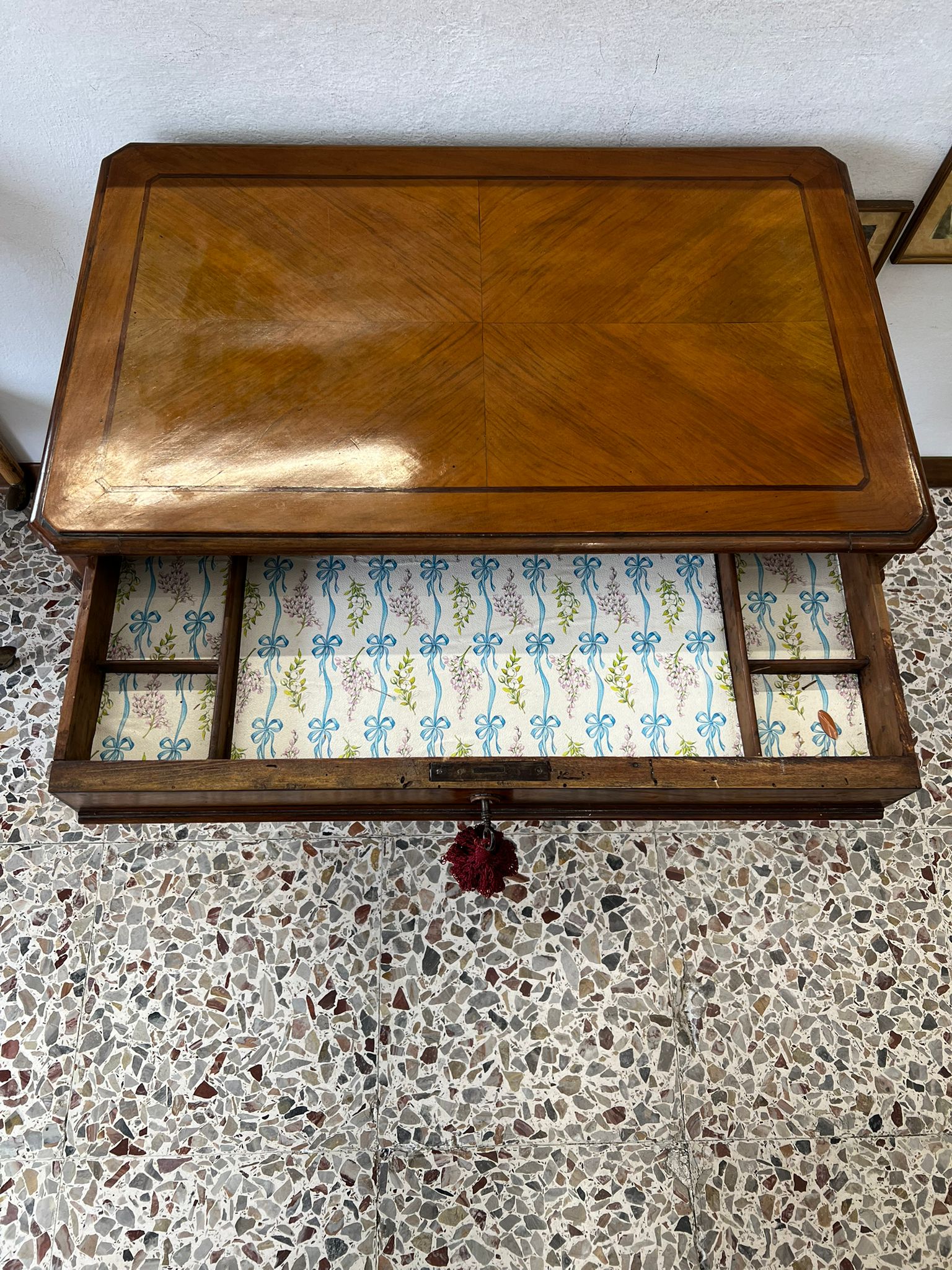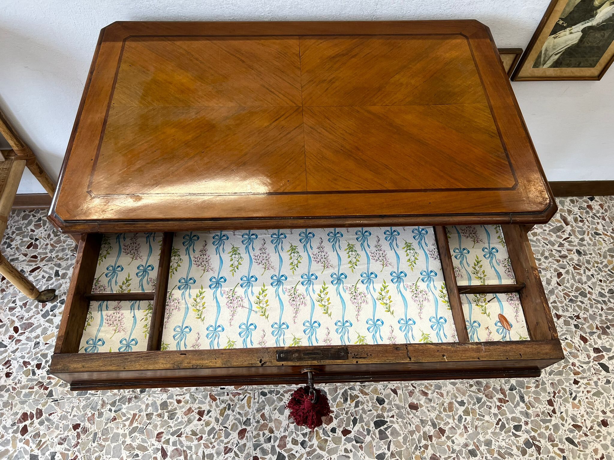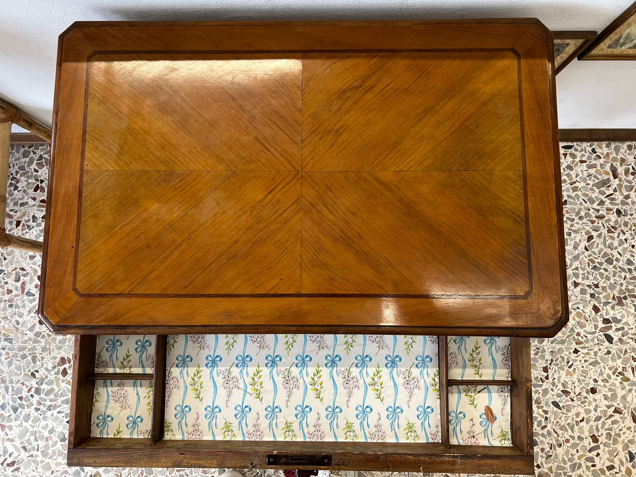 TAVOLINO DA LAVORO PER CUCITO IN NOCE SPINATO E FILETTATO SECONDA META’ DEL ‘800