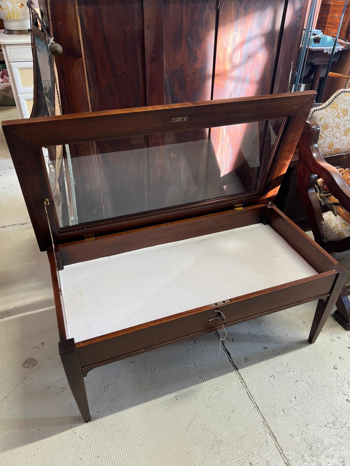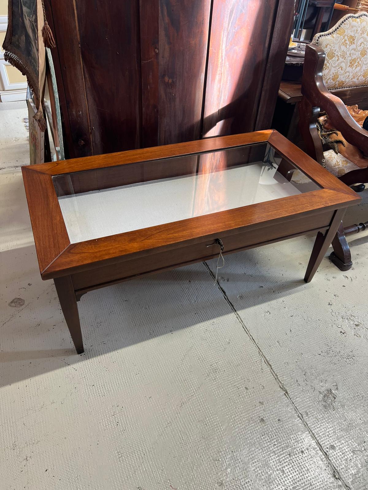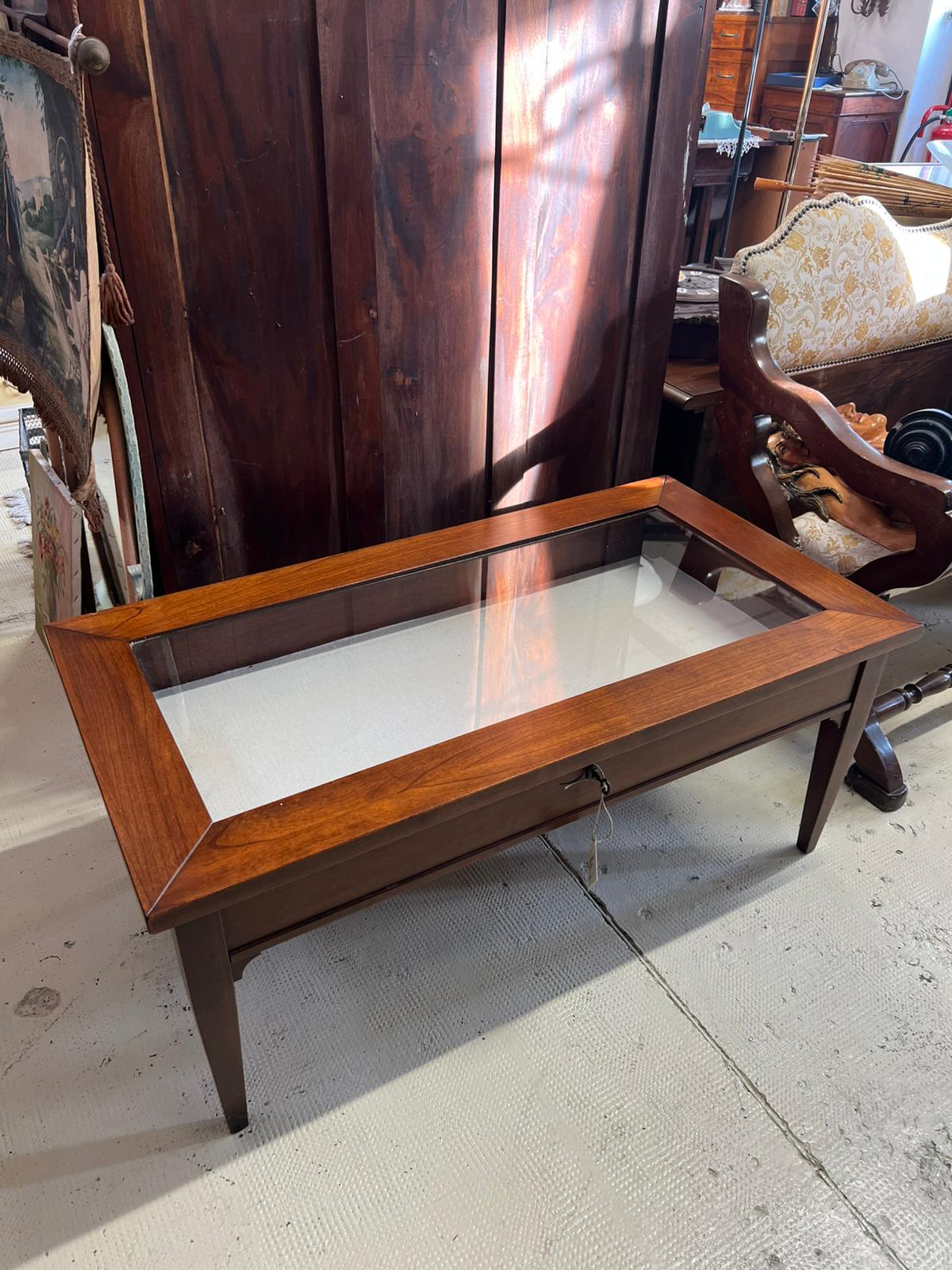 TAVOLINO IN LEGNO E VETRO CON TECA ESPOSITIVA E SERRATURA