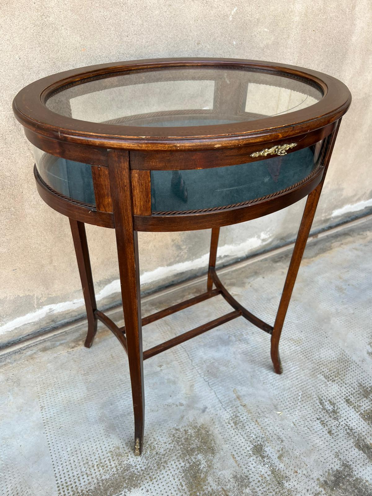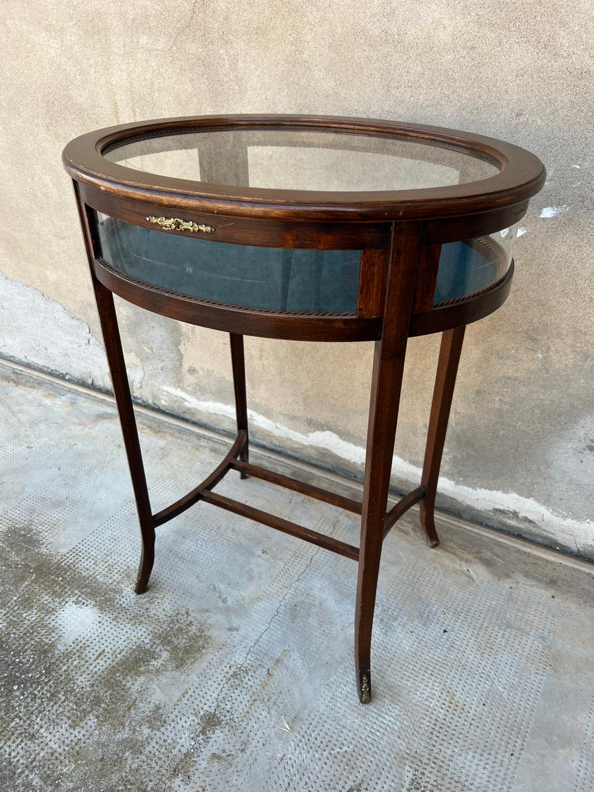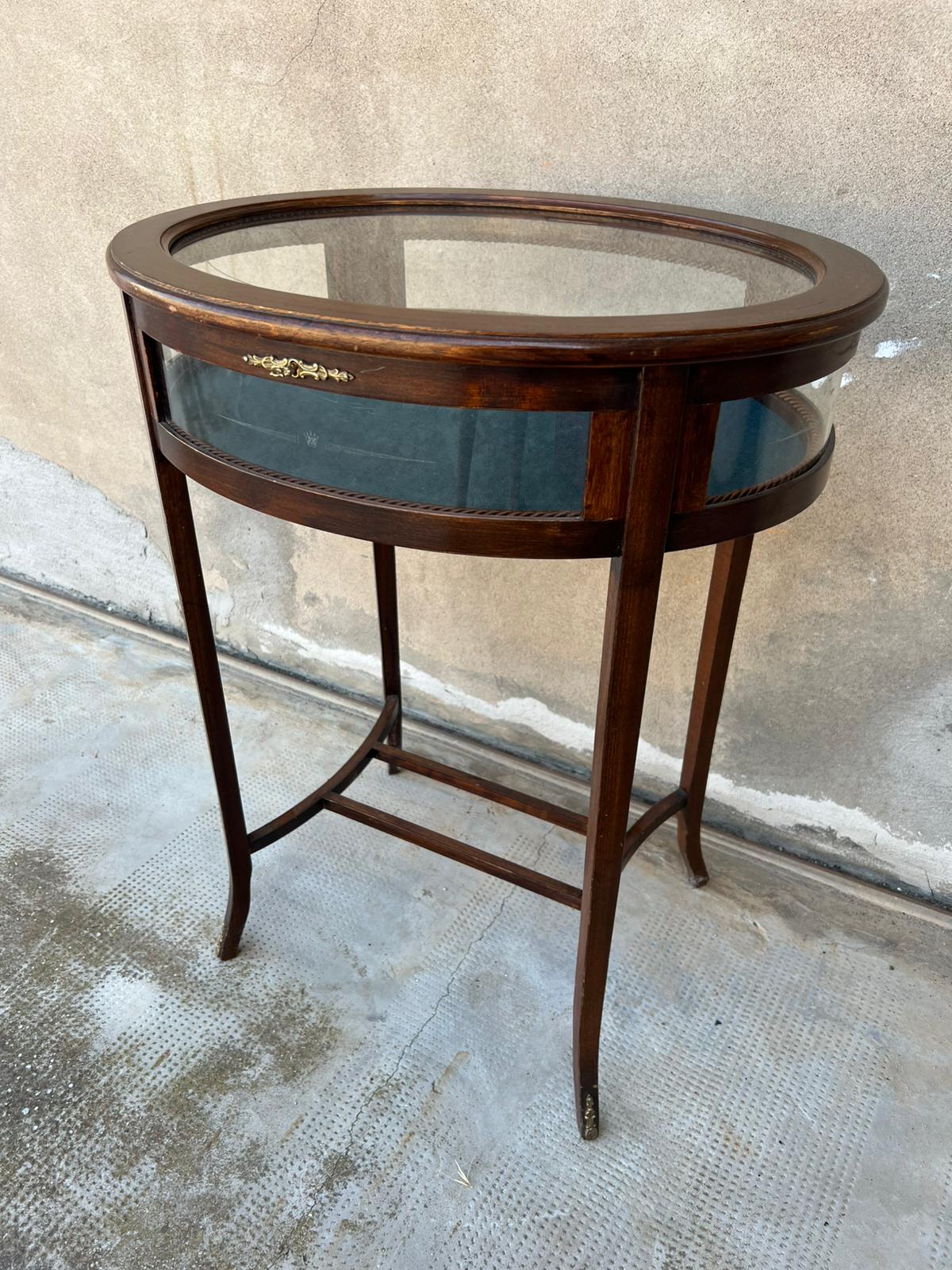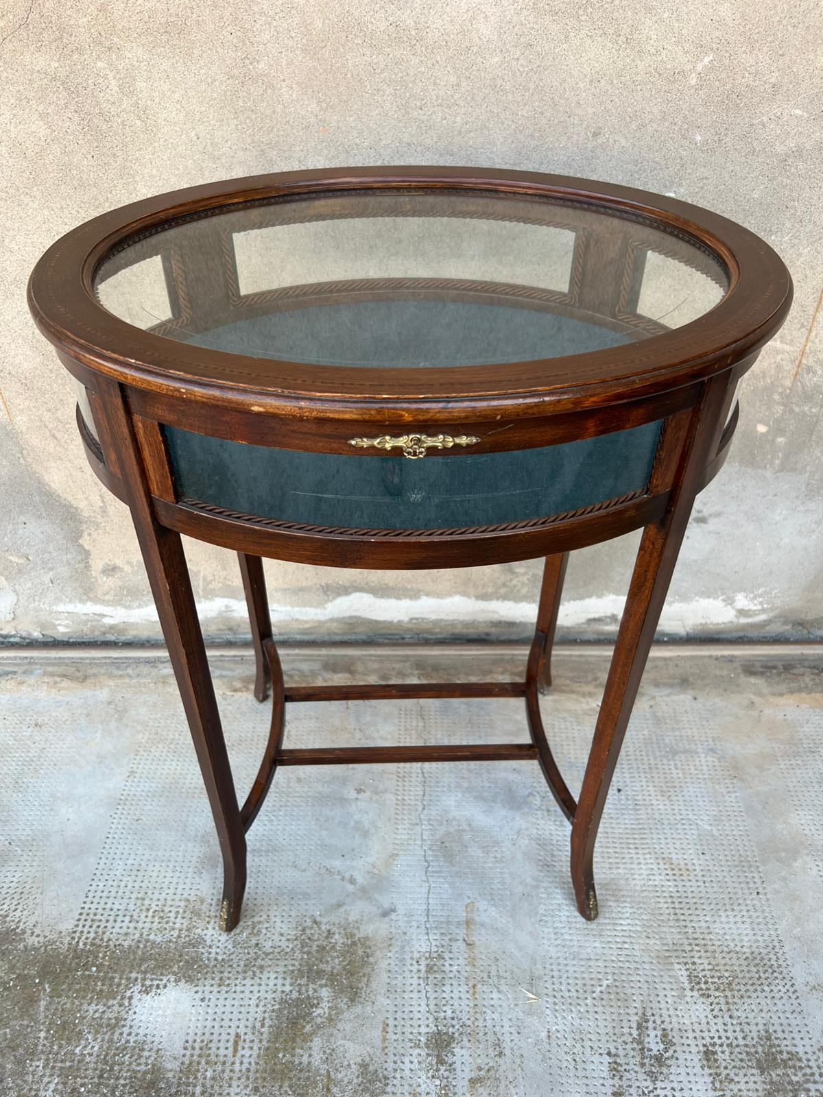 TAVOLINO/VETRINETTA OVALE IN LEGNO E VETRO DECORATO