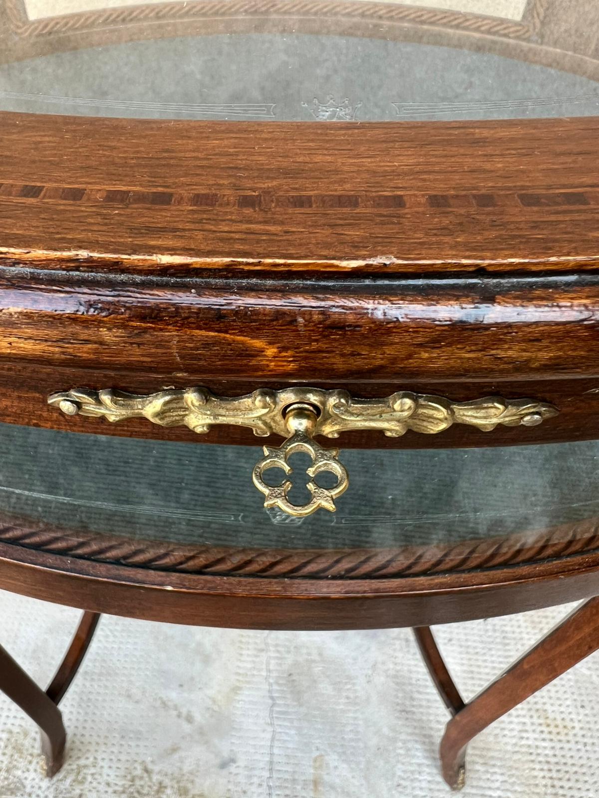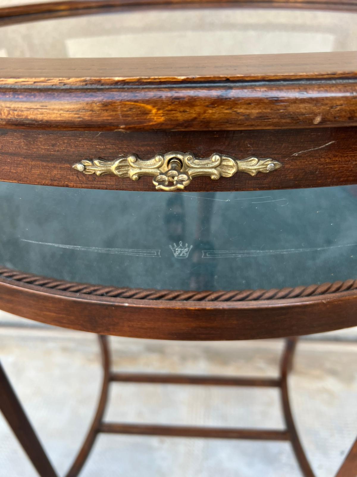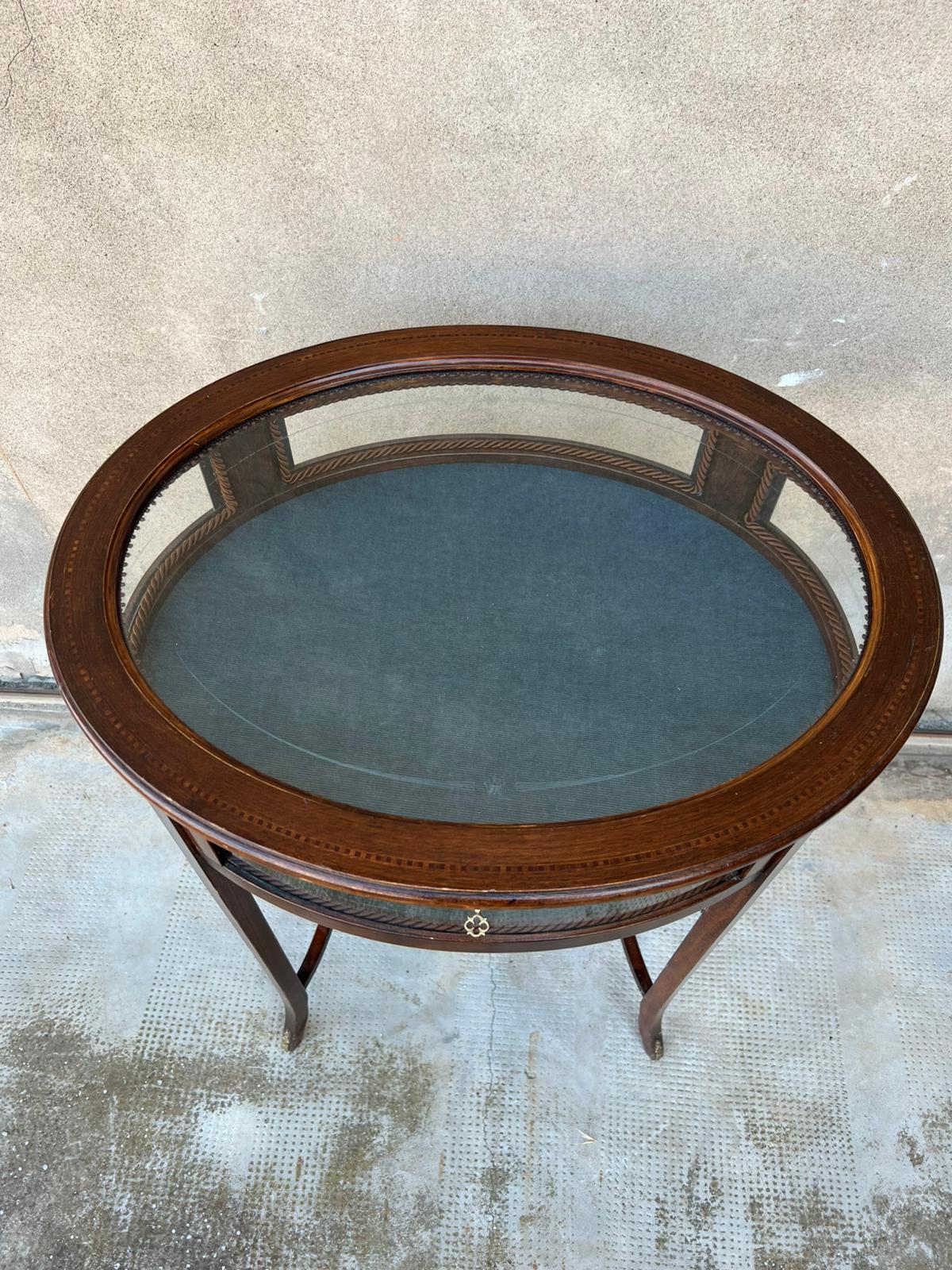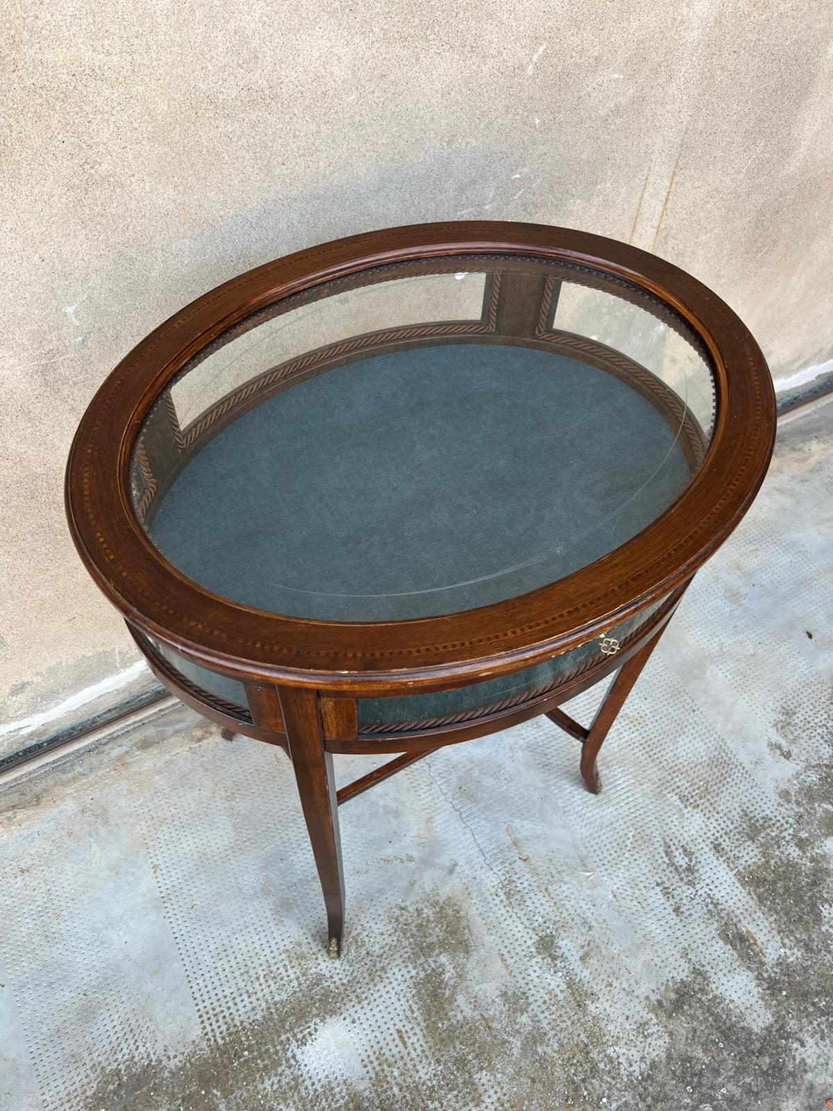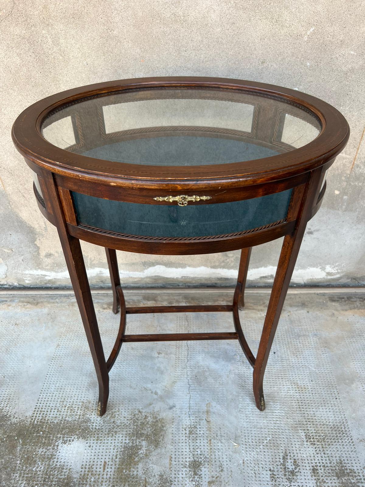 TAVOLINO/VETRINETTA OVALE IN LEGNO E VETRO DECORATO