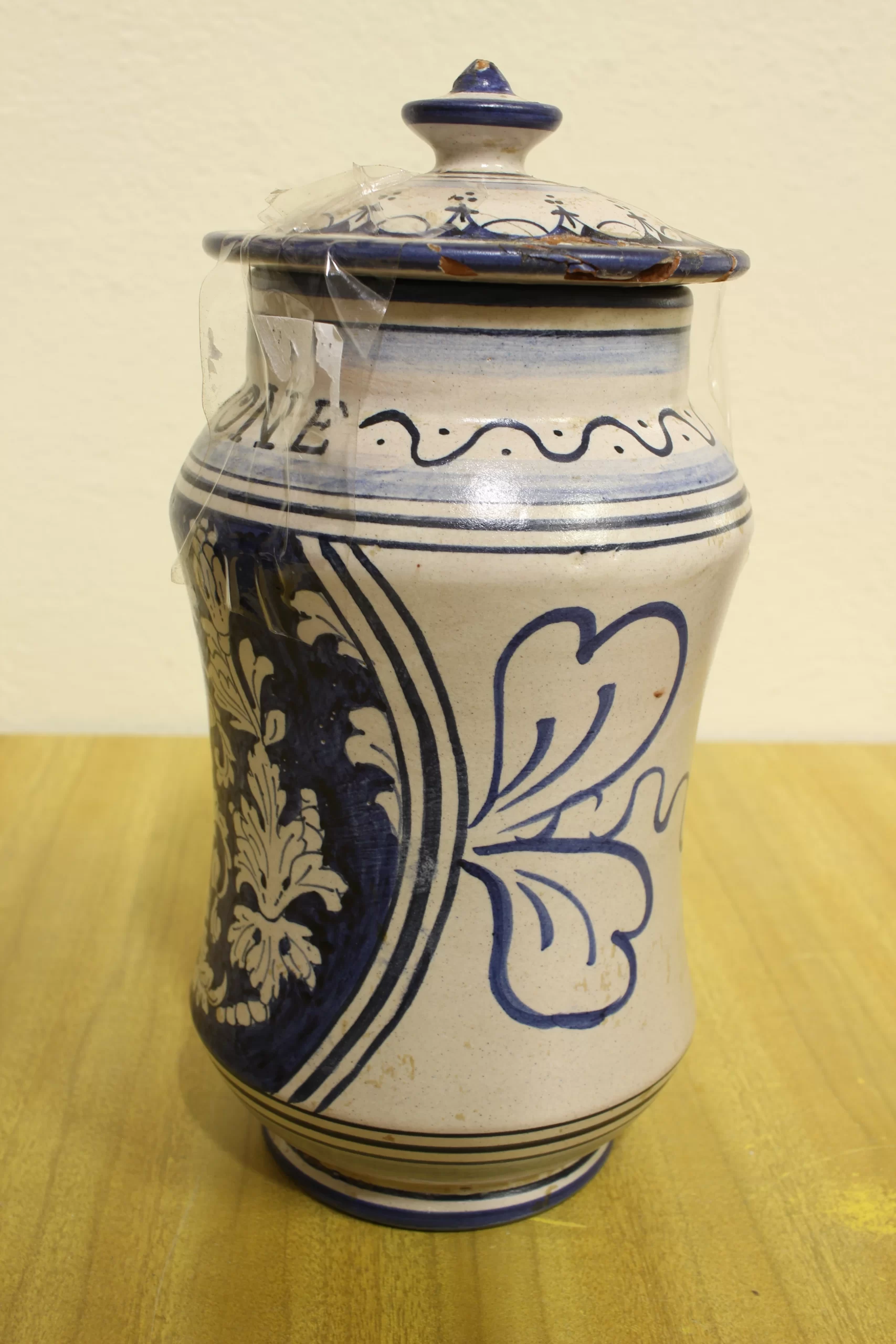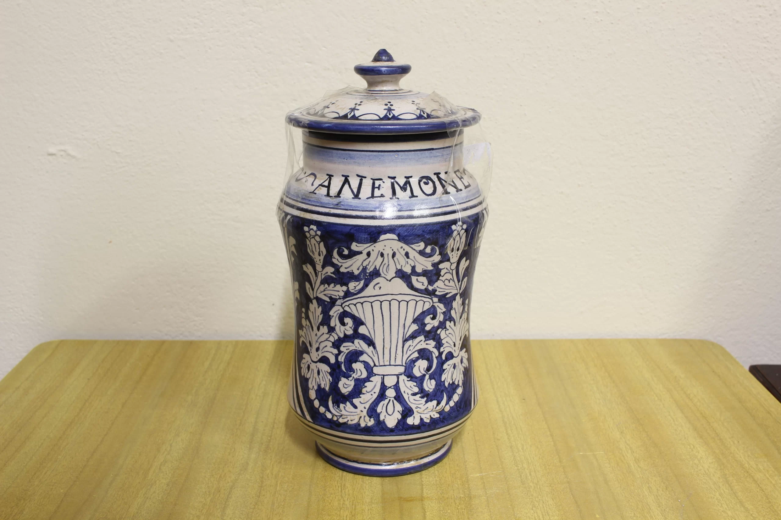 Vaso per spezie stile vintage in ceramica Deruta. Recante la scritta “Anemone”.